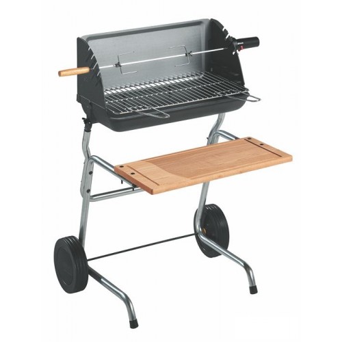 Контейнер очага чугунный, перенастраиваемый, практичный и функциональный, гриль и жаровня в одном, контейнер двойного назначения (гриль/жаровня), легко перемещаемая тележка, рабочая доска с передней стороны, регулирование решетки по высоте, несколько положений для вертела, двигатель и вертел в комплекте поставки.