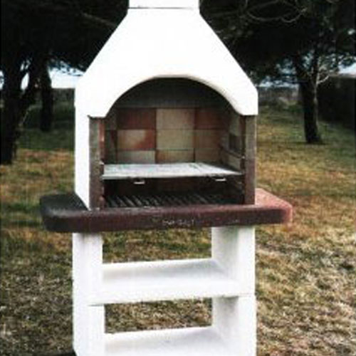 Плита и внутренний модуль барбекю из конгломерата в белом и коричневом цвете. Топка из огнеупорного кирпича со встроенными направляющими и решеткой для жарки.