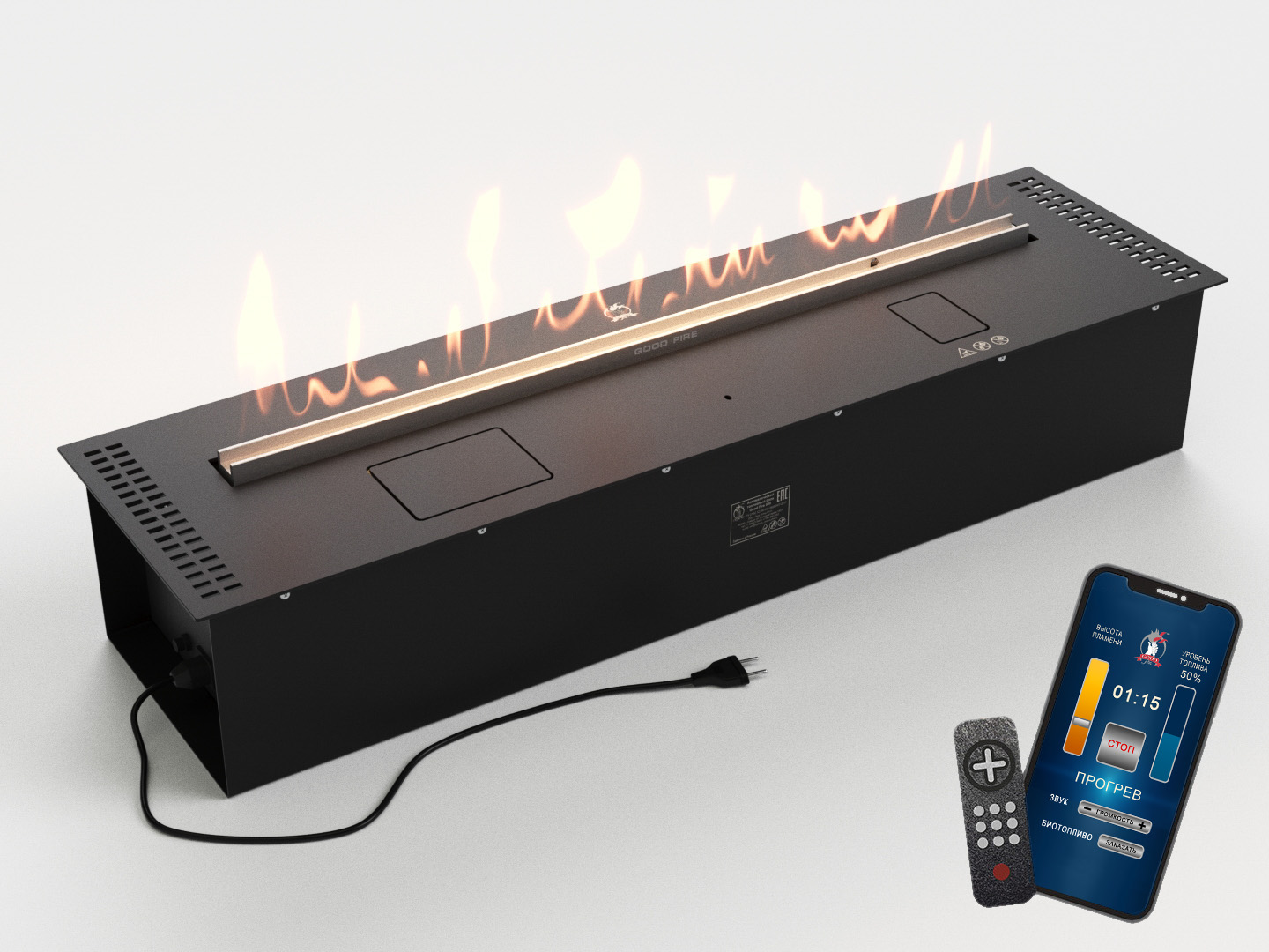 Модель Good Fire 1000 RC Black управляется с дистанционной панели, но также есть аналогичные модели от того же производителя, которые могут управляться дистанционно с пульта или телефона! Еще одна очень интересная функция автоматических каминов Good Fire - аудио-поддержка (звуки горящего огня добавлены к последним версиям биокаминов).
