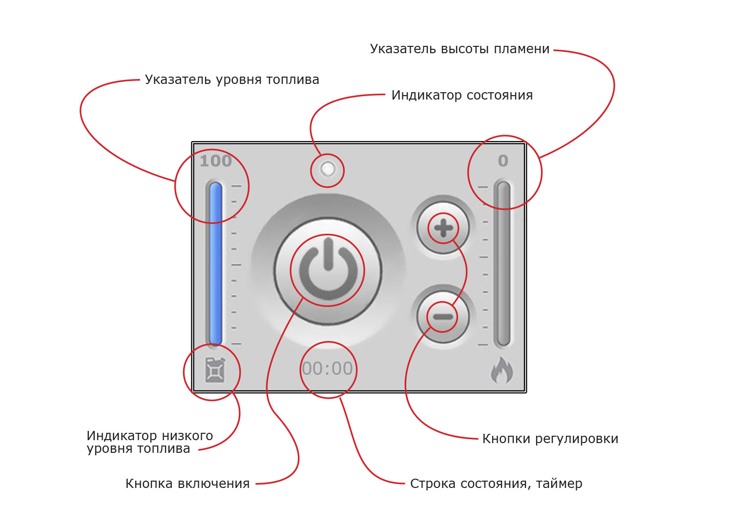 Биокамин оборудован цветным сенсорным дисплеем, который отображает уровень топлива в баке, время работы, высоту пламени. Интерфейс имеет функцию блокировки камина от случайного включения или блокировки от использования биокамина нежелательными лицами.