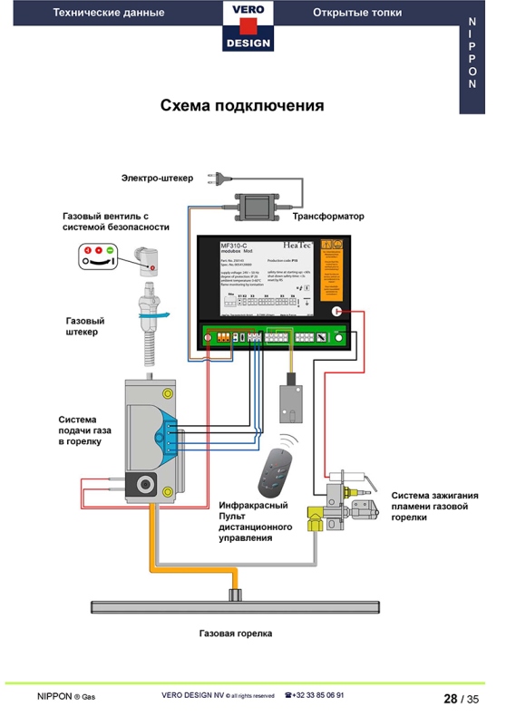 • Термодатчик в дымосборнике каминной топки – ТТВ, блокирует подачу газа в каминную топку если температура в дымосборнике превышает допустимый уровень нормального режима работы камина.