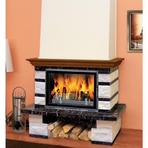 Каминная облицовка изготовлена из качественного натурального полированного мрамора сорта Emperador flowers и колотых элементов в виде кремово - жёлтого песчаника. Подходит для топок 700 серии с прямым стеклом.