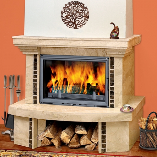 Пристенная каминная облицовка Andalusia LETICIA BK с боковыми стенками и основанием из мрамора Giallo, столешница и декоративные элементы - из мрамора Emperador.
