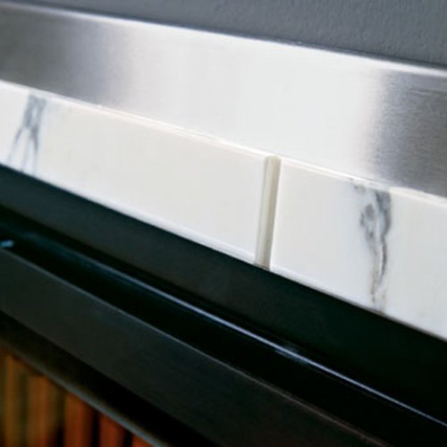 Облицовка Arabesque из обработанного мрамора Arabescato Bianco. Декоративные вставки из нержавеющей стали. Может быть выполнен в мраморе Tigrato Orientale бежевого оттенка.