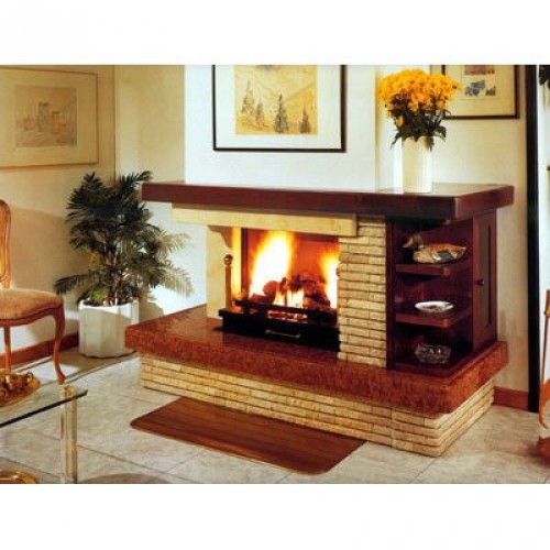 Фронтальный камин из мрамора грубой обработки Crema - кладка лозете. Плита из полированного красного мрамора Rosso Forte. Боковой пилар и консоль из полированного Crema Marfil. Деревянные балка и полочки. Металлическая топка 070, открытая сбоку, с колосником и зольником.