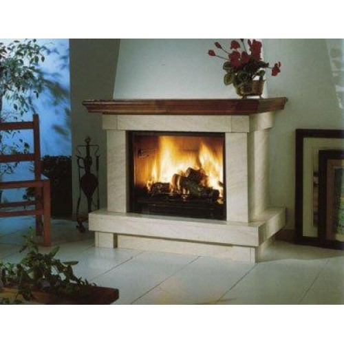 Фронтальный камин серии Stylo из полированного мрамора Crema Moka. Деревянная балка с закругленным кантом.