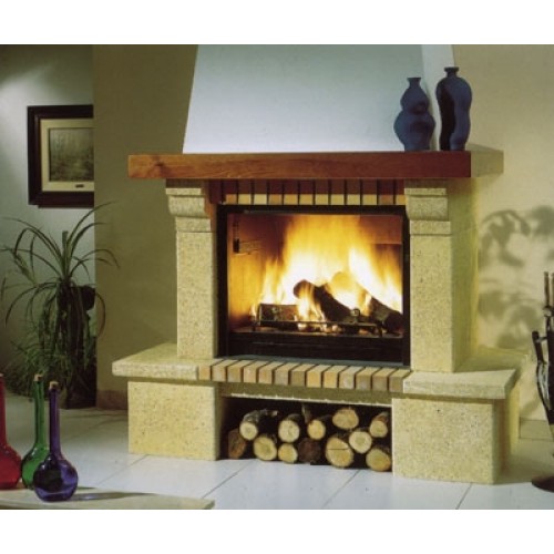Фронтальный камин серии Stylo из Гарского камня. Плита и консоль из огнеупорного кирпича толщиной 5 см. Ниша для дров, металлическая топка 904, колосник и зольник.