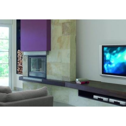 Плоский фронтальный камин из кварцита Cuarcita (60х30 см), шпонированная плита Wengue. Изоляция и консоль из нержавеющей матовой стали. Вертикальный металлический дровник в черном цвете. Стандартный инсерт Panorama Clima.
