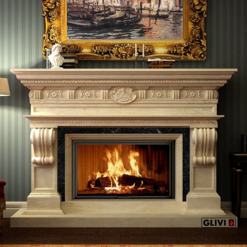 - Камин выполнен из состаренного травертина Navona; из полированного мрамора Negro Marquina.