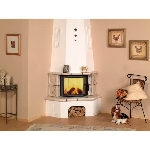 Угловой камин Hark 3/123.6 из изразцов античного кремового цвета. В комплект облицовки входят опорная рамка с крепежами, лента, клей, DVD с инструкцией по установке, бетонный цоколь (если предусмотрен), и шамотный короб с проматом (если короб конструкционно входит в облицовку). В комплект не входят дымоотводные трубы, промат для изоляции стен, гофра для подвода воздуха под облицовку. Решётки поставляются опционно.
