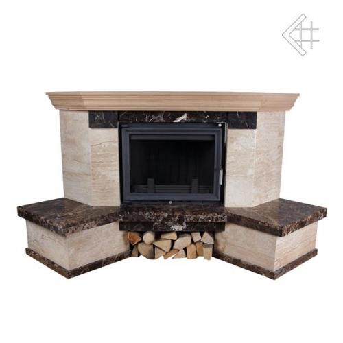 Представлена бюджетная каминная облицовка в угловом исполнении. Каминная облицовка выполнена из натурального полированного мрамора Emperador Brown, Breccia Sarda и состаренного травертина с дубовой балкой. В связи с тенденцией к использованию каждого сантиметра имеющейся площади, владельцы загородных домов ищут способы активно использовать каждый квадрат жилого пространства. Опыт показывает, что угол в доме чаще всего остается не задействованным, поэтому именно в нем целесообразно разместить камин. Таким образом можно убить сразу двух зайцев: установить угловой камин в своем доме, сэкономив площадь жилища, и отлично украсить интерьер помещения, ведь из угла огонь видно практически из любого места в комнате.