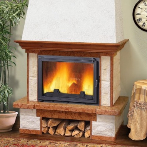 Madeira Perlita выполнена из натурального камня: мрамор Sunny Yellow и Rosso Verona. Вариант пристенный или угловой. Подходят под эту облицовку топки шириной до 700 мм с прямым стеклом и боковым открыванием дверцы.