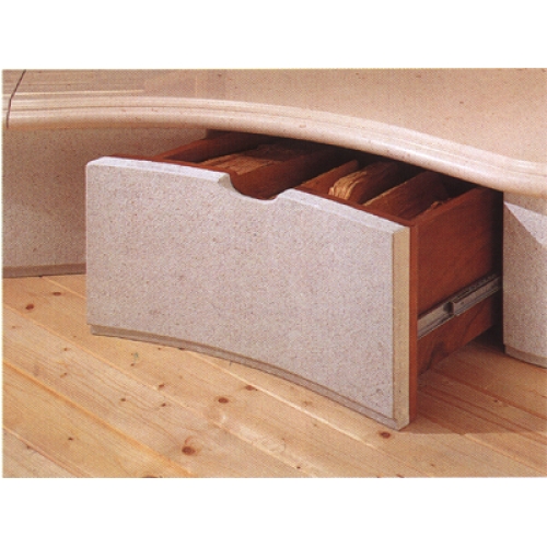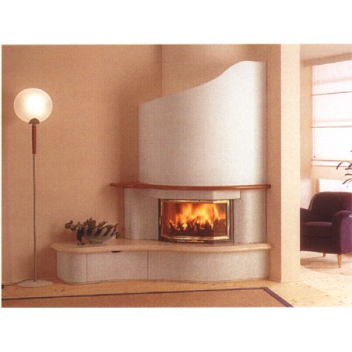Угловой камин Palazzetti Marsiglia выполнен из белого бучардированного камня, столешница из полированного мрамора Bianco Mediterraneo, балка из светлого ореха.