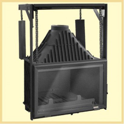 Топка снабжена большим плоским стеклом и легким и бесшумным подъемным механизмом, с уравновешивающими противовесами и тросовой системой (или цепной передачей), выдерживающим нагрузку в несколько сотен килограммов, дверца топки открывается вверх и на себя, для удобной чистки стекла.
