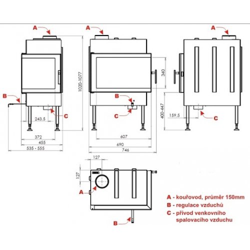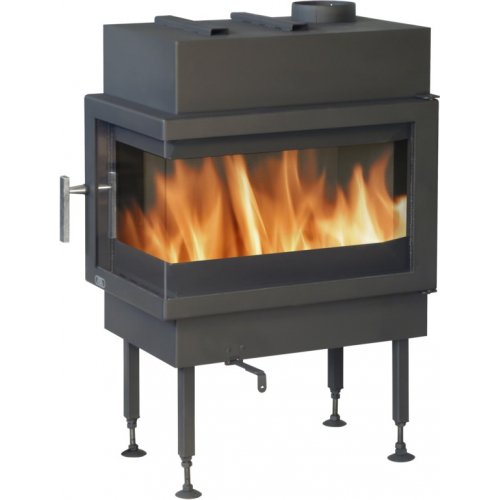 Материалом для изготовления топки послужила легированная жаропрочная сталь, футеровка выполнена вермикулитом. Отверстие для подключения системы дымоудаления находится в верхней части прибора. Воздух, необходимый для горения, подается либо из жилого помещения, либо с улицы. Второй вариант, безусловно, комфортнее, поэтому при покупке имеет смысл заказать комплект деталей для подключения топки к наружному воздуховоду.