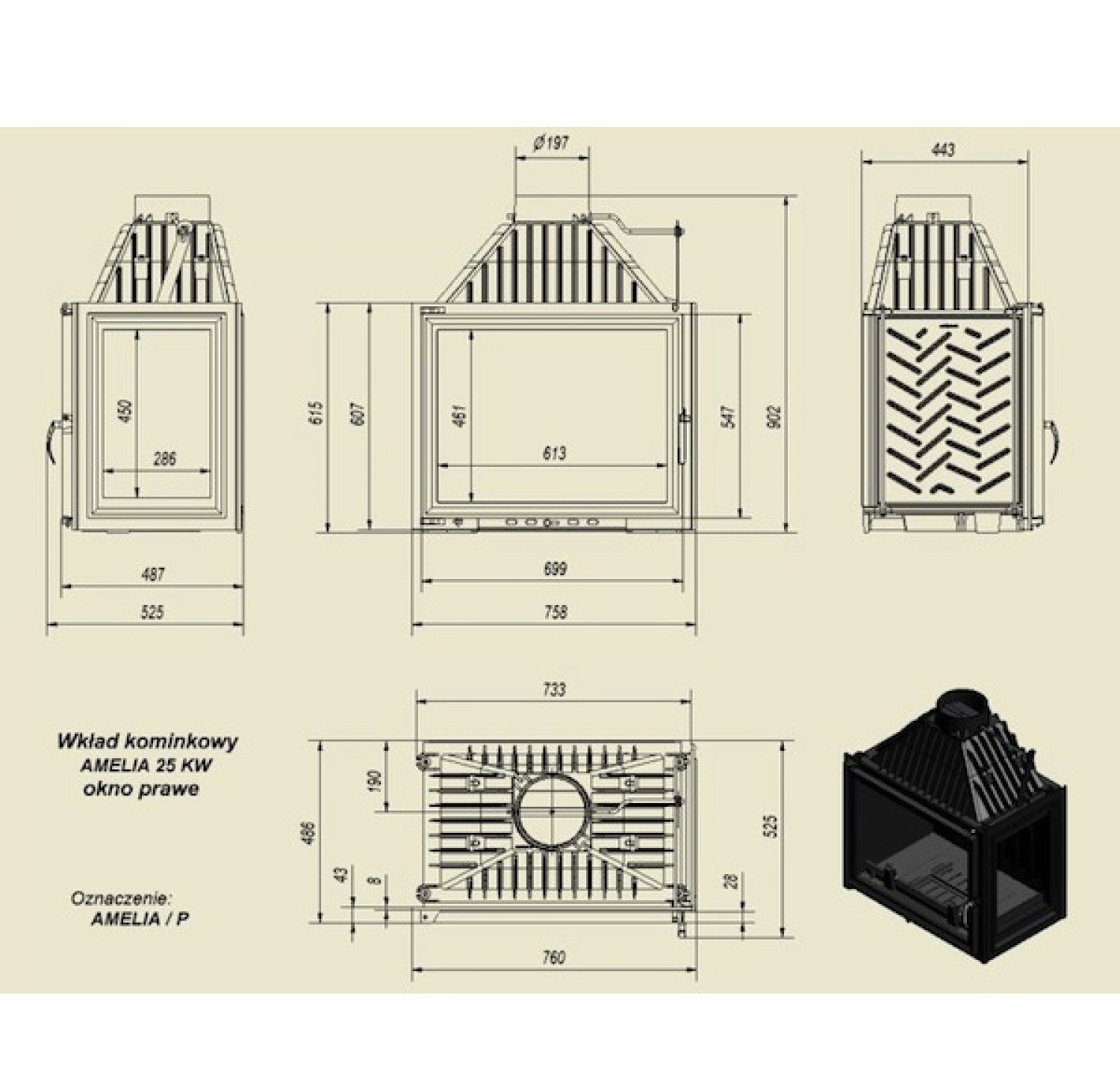 Amelia Р— топочная камера или топка-вкладыш, предназначенная для отопления дома площадью до250 кв.м. Amelia Р— модель топки, выполненной из чугуна, самой большой мощности среди чугунных топок KRATKI. Топки, выполненные из чугуна практичны вэксплуатации, долговечны, обладают хорошими тепловыми характеристиками. Рассматриваемая модель топки— Amelia Р— предназначена для угловых каминов— топка имеет дополнительное стекло справой стороны. Особенности оборудования серии Amelia РотKRATKI: Чугунная топка непрерывного сгорания; Топка высокой мощности, предназначена для больших помещений; Топка углового типа— справой стороны имеется дополнительное остекление; Теплоемкость прибора увеличивают ребра повсему корпусу; Топливо— сухие дрова длиной до500 мм; Стекло— термостойкая стеклокерамика, предел нагрева 800 С; Полная герметичность дверцы; Система «двойного дожига»; Топка имеет съемную ручку надверце; Прозрачность стекла обеспечивает система встроенного обдува; Предусмотрен держатель дров— непозволяет рассыпаться при открытии дверцы; Дно топочной камеры имеет отверстие для золы.