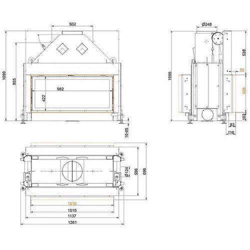 Двухсторонняя каминная топка с прямым стеклом. Топочная камера футерована шамотом. Подъёмный механизм двери (система Easy-Lift) с одной стороны. С другой стороны дверца откидывается для чистки. Возможен вариант топки с подъёмным механизмом с двух сторон (по запросу). Ширина дверки 982 мм. Высота дверки 422 мм. Возможно подключение воздуха из-вне.