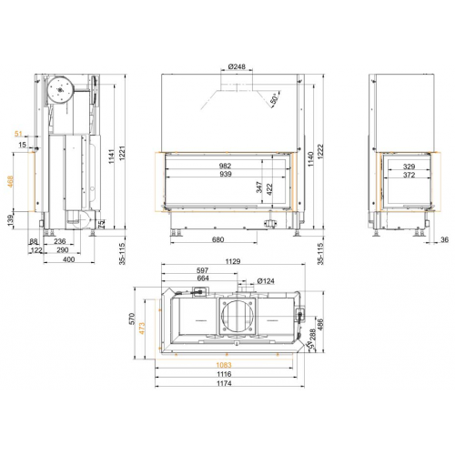 (При закрытии специальных «Тепловых штор» HeatSTOP в топочной камере сгорания сохраняется до 90% излучения. Жар камина экранирует обратно. Ваша прикаминная зона может приблизиться к очагу практически до 50 см.)