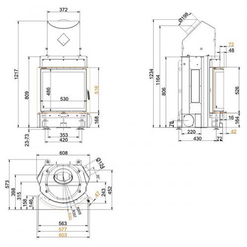 Стальная топка со сферическим стеклом. Боковое открывание двери. Ширина дверки 530 мм, высота - 486 мм. Возможно подключение воздуха из-вне.