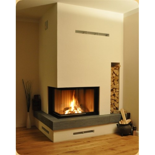 Угловая каминная топка с цельным Г-образным стеклом. Боковое стекло слева. Дверца с подъемным механизмом (система Easy-Lift). Топочная камера футерована шамотом. Ширина дверки 657/427 мм, высота - 545 мм. Возможно подключение воздуха из-вне.
