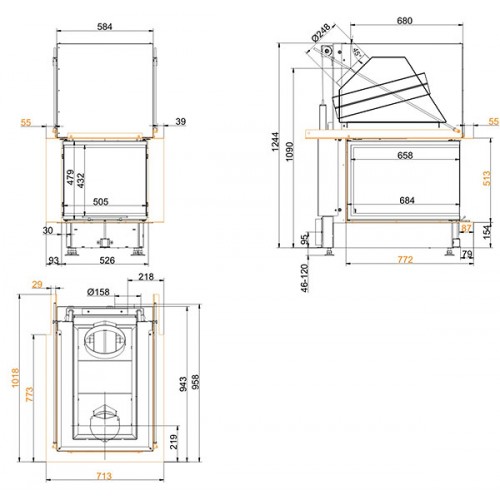 Трёхсторонняя каминная топка. Топочная камера футерована шамотом. Подъёмный механизм двери (система Easy-Lift). Ширина дверки 658/505/658 мм, высота - 432 мм. Возможно подключение воздуха из-вне.