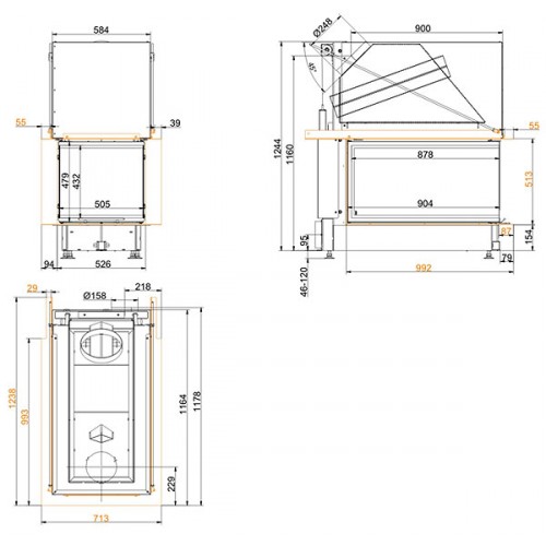 Трёхсторонняя каминная топка. Топочная камера футерована шамотом. Подъёмный механизм двери (система Easy-Lift). Ширина дверки 878/505/878 мм, высота - 432 мм. Возможно подключение воздуха из-вне.