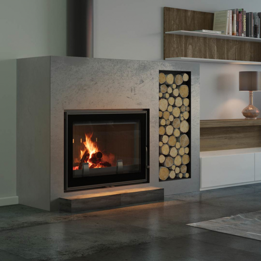 • Декоративная стеклянная панель типа glass, которая выдерживает температуру до 660 °C и предоставляет камину современного и элегантного вида, оптически увеличивает переднюю часть топки.