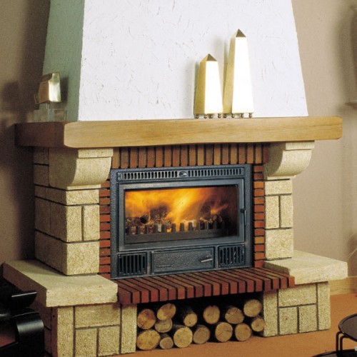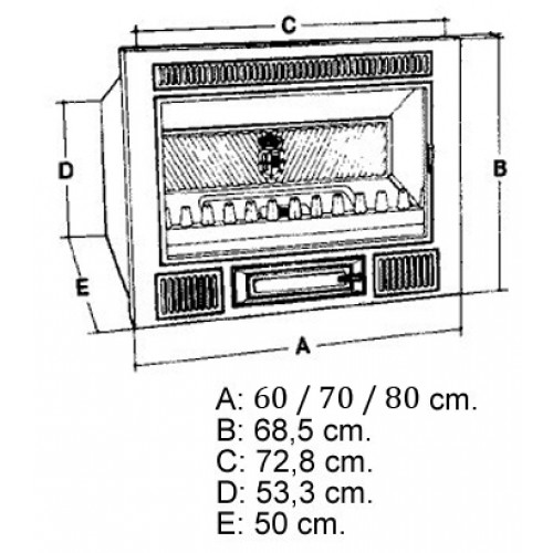 Высокоэффективная встраиваемая каминная топка C-3/80 из огнеупорного чугуна, с прямым фасадом и дверкой с керамическим стеклом. Имеется предохранительный термостат.