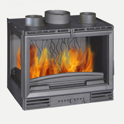 Чугунная вставка для камина Grand Vision turbo 700 снабжена уникальной системой самоочистки стекла - воздушный поток, направленный на стекло в дверце, самостоятельно очищает его от наседания копоти и грязи. Каминная топка также снабжена высоким дымосборником для обеспечения тяги в дымоходе, жестким корпусом со множеством ребер для увеличения теплоотдачи и прочности изделия, чугунным дефлектором (пламярассекателем) для защиты дымохода от термонагрузки, двойной задней стенкой для повышения срока службы топки, выдвижным зольным ящиком для удаления золы во время горения и регулятором подачи воздуха для более экономичного расхода дров. Прямое стекло, вставленное в дверцу, является закаленным и способно выдерживать температуру до 750 0С.