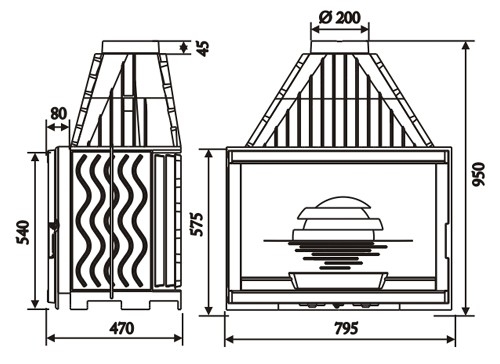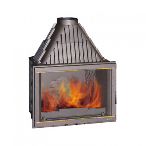 Чугунная топка с увеличенным обзором огня. Регулировка закрытия дверцы, увеличенный дымосборник, боковое открывание дверцы.
