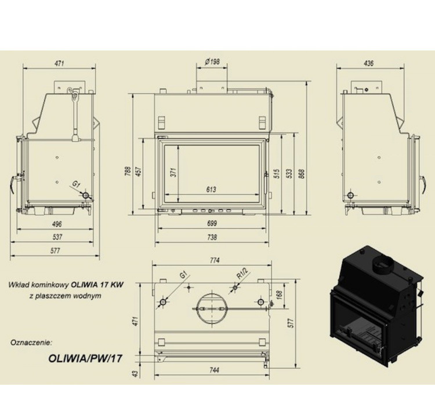 Oliwia PW/17/GLASS (двойное стекло) - чугунные топочные камеры польского предприятия Kratki, производителя каминной продукции. Oliwia PW/17— встраиваемый очаг с водяным контуром— следующая помощности модель после Zuzia PW/15. Модели этой серии имеют чугунную камеру сгорания истальную «рубашку» теплообменника. При мощности топки 17 кВт встроенный водяной теплообменник может вырабатывать 14 кВт тепла. Данная топка— модификация стандартной модели сдвойным плоским фасадным стеклом. Преимущества топок серии Oliwia PW/17/ GLASS отKratki: Топка закрытого типа снепрерывным горением ивстроенным водяным теплообменником мощностью 14 кВт иобъемом 35 л; Фасад сшироким прямым двойным стеклом и боковым открытием дверцы; Высокий дымосборник, присоединение дымоход сверху; Топливо— твердая древесина, коричневый уголь; Рама топки истанина изготовлены изтермоупорного чугуна; Топка с водяным теплообменником изготавливается изнелегированной листовой стали специальных сортов; в камере сгорания расположены дымоградные трубы увеличивающие поверхность теплообмена втопке; Термостойкое стекло Robax (порог температурной устойчивости 800 С); Система чистого стекла предотвращает быстрое загрязнение; Встроенный шибер, система съемной ручки; Возможность регулировки притока воздуха в камеру сгорания; Решетка надне камеры сгорания, ящик для сбора пепла; Накорпусе топки предусмотрены специальные ручки, предназначенные для удобства транспортировки; Держатель для дров, предотвращает рассыпание дров при открытии топки.