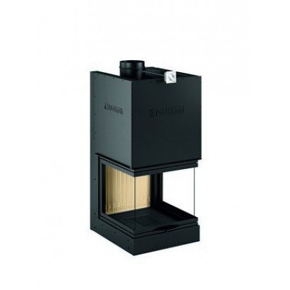 Топка имеет трехстороннее стекло. Подъемная дверца с жаропрочным стеклом, что позволяет наслаждаться открытым огнем, которая открывается на петлях для чистки. Стальной кожух и внутреннее основание из чугуна обеспечивают прочность и долговечность. Имеет современный дизайн.