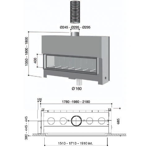 Существует на выбор три ширины портала: (1,50 м, 1,70 м или 1,90 м), который являет собой сочетание эргономичности, простоты и безопасности механизма открытия. Дверь также наклоняется на 45 ° для безопасности очистки. Внутри топка выложена изоляционным материалом из черной стали. Герметичная система прямого притока свежего воздуха (O 160 мм). Верхние и нижние вентиляторы обязательны. Гарантирована эффективность при минимальной длине трубы (внутренней и внешней) в 5 м.