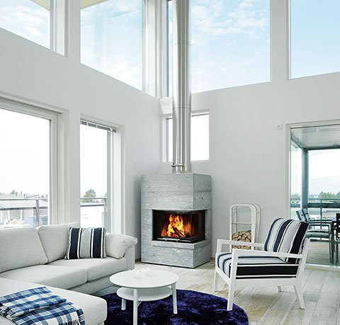 Угловой интерьерный камин DEKO в основном рассчитан на нерегулярное использование, когда главным является создание уютной атмосферы живого огня. Дрова в камине сгорают медленно, предоставляя отличную возможность предаться неспешным размышлениям, наблюдая за игрой пламени сквозь большую стеклянную дверцу, оснащенную подъемным механизмом.