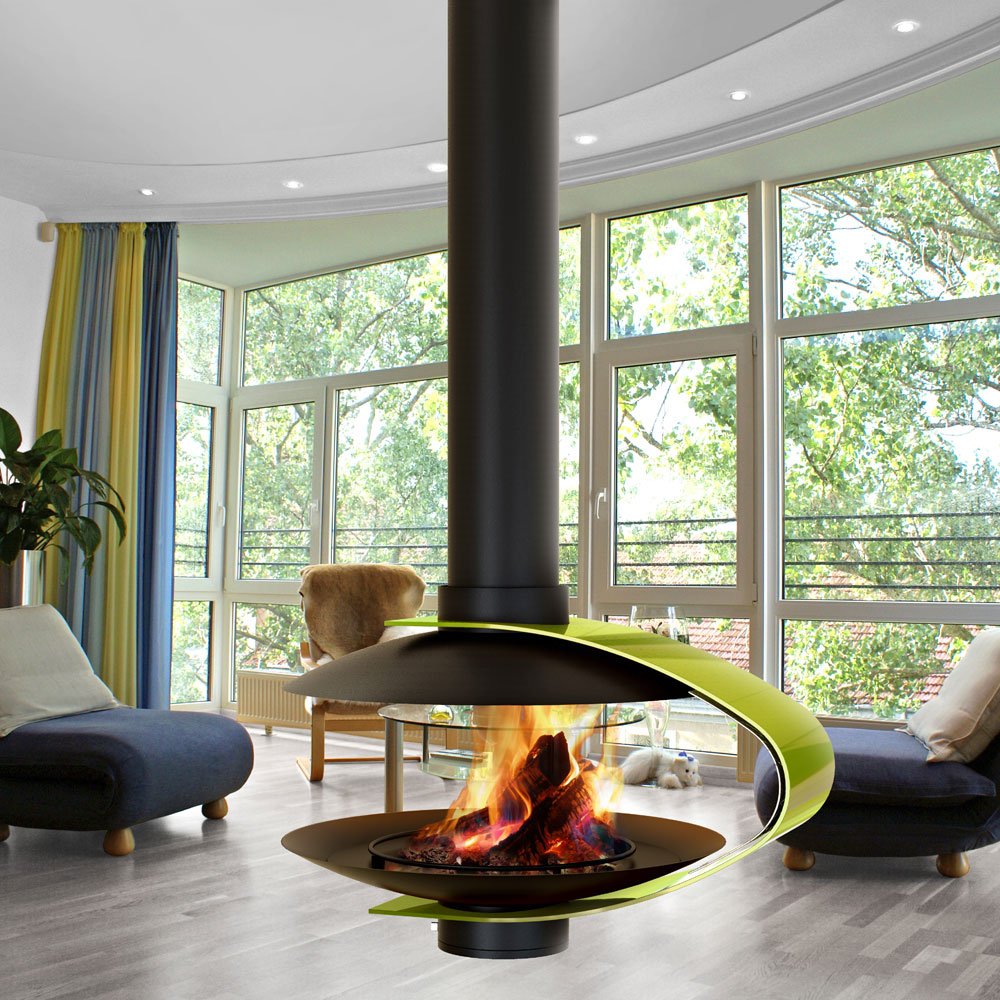 Эксклюзивный центральный подвесной камин, без системы вращения, с декоративным элементом в любом цвете палитры RAL.