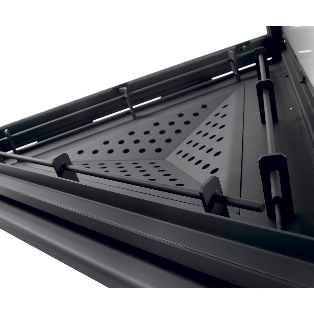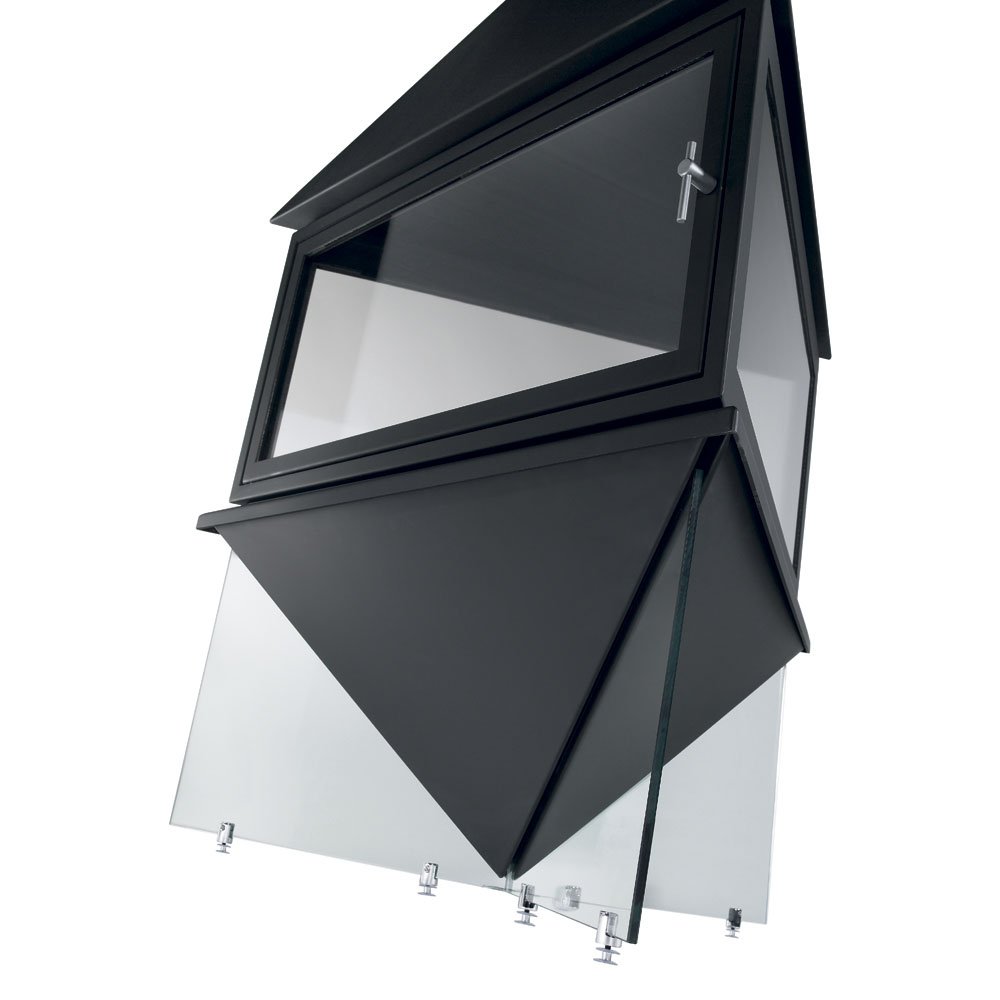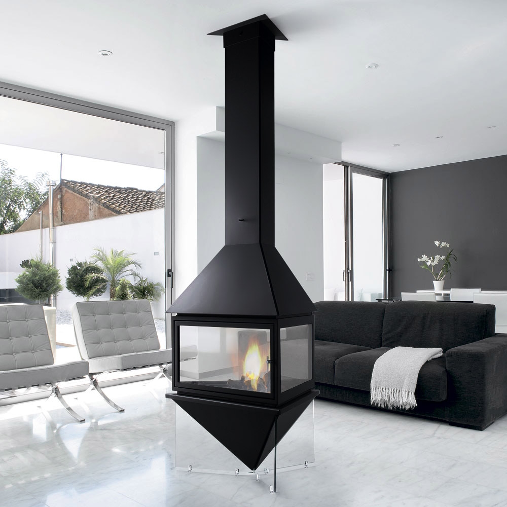 Центральный трехгранный камин со стеклом, включает стеклянный пьедестал.