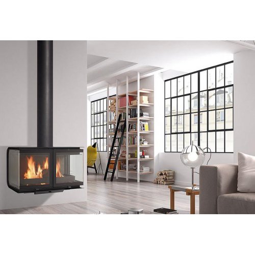 Фронтальный камин в стиле хай-тек отличается эксклюзивным дизайном. Корпус изготовлен из огнепрочной стали с финишным эмалевым покрытием. Представленная модель камина оборудована двумя угловыми дверцами из прозрачного стекла. За счет бокового остекления увеличивается потрясающий вид на огонь. Звадняя стенка облицована вермикулитом черного цвета. Выдвижной зольный ящик облегчает уход за камином.