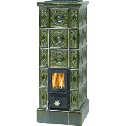 Располагается печь на кафельном цоколе, выпускается только в зеленой цветовой гамме, подключение дымохода заднее.