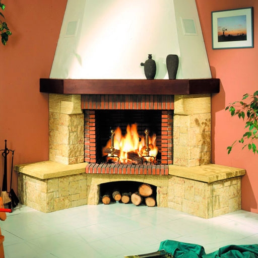 Угловой камин, выполненный из камня и мрамора Роса Дорадо грубой обработки, без шва. Плита, быки и консоль дровника - из Гарского камня. Центральная плита, боковые стены и консоль из огнеупорного кирпича тощиной в 3 см. Деревянная балка Iroko.