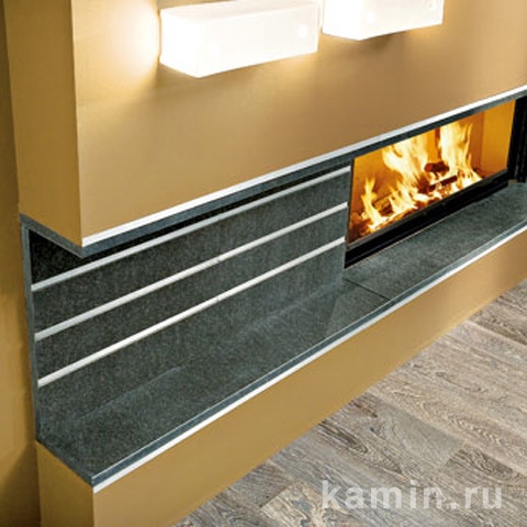 Каминная облицовка из черного гранита с горизонтальными вставками из матовой нержавеющей стали, возможна удлиненная версия.