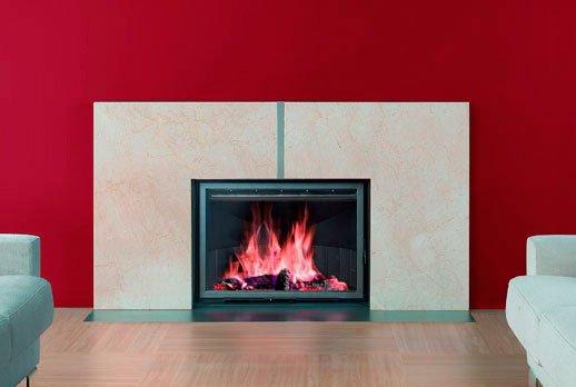 Камин из полированного Crema Marfil. Напольное покрытие, обрамление топки и защитный экран из нержавеющей матовой стали. Металлическая топка Double 86
