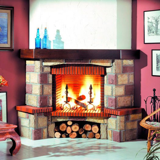 Угловой камин из натурального белого камня и красного Rojo Valles. Плита из обожженного кирпича 3 см толщиной. Деревянная балка из Iroko. Кирпичная топка из обожженного кирпича толщиной 3 см.