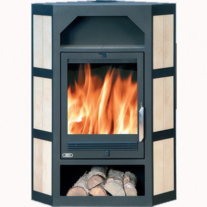 Корпус угловой каминной модели ABX Lahti выполнен из листовой стали, а внешняя отделка — из светлой керамики. Большое стекло топки позволяет наслаждаться красивейшем видом пламени.