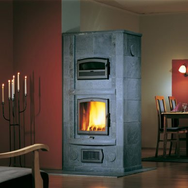 Хлебопекарная печь-камин Solo выполняет сразу две функции за цикл топки. В отделении для приготовления пищи дрова не сжигаются, оно согревается за счет согревания аккумулирующего камина. Жарить и печь можно начинать тогда, когда печь достигнет нужной температуры.