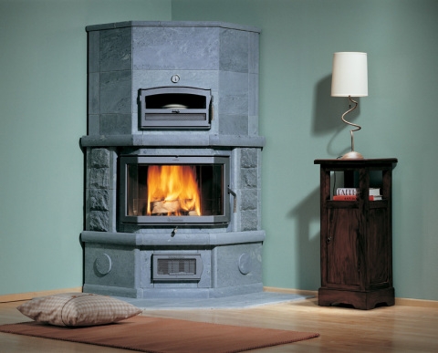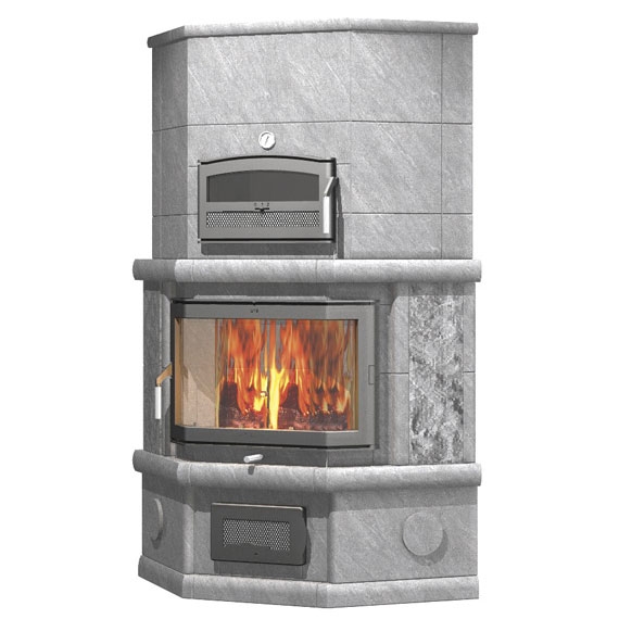 Угловая печь-камин с духовкой. 3 тепловой класс. Заднее нижнее подключение дымохода.
