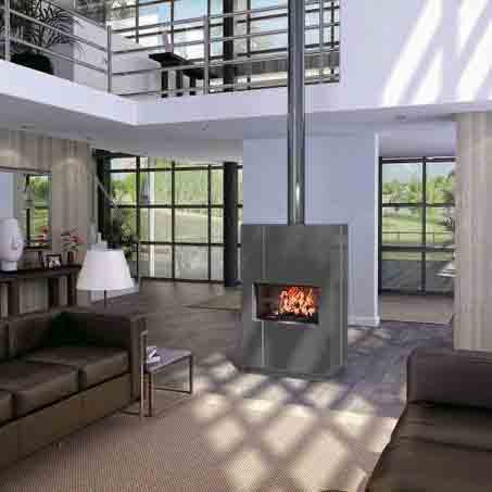 Металлическая отопительная печь-камин. Ввод наружнего/первичного воздуха. Облицовка для топки из нержавеющей стали. Вертикальная полоска-инкрустация из нержавеющей стали. Поднимающаяся и открывающаяся классическим способом дверца.
