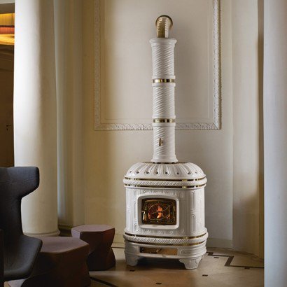 Одним из достоинств этой керамической дровяной печки является просторная топочная камера. Помимо основной фронтальной дверцы эта модель может иметь дополнительную боковую дверцу. Топочная камера этой модели изготовлена из чугуна. Латунная отделка делает эту модель законченной и придает ей особый шик.