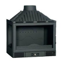 Каминная топка из чугуна. Прямой фасад. Стекло слева. Топка работает на дровах.