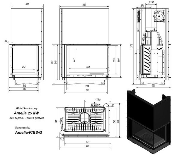 Топка AMELIA/P/BS, Г-образное стекло справа, гильотина