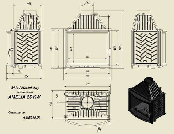 Каминные топки поставляются в Россию компанией Белфорт. Эта модель с выгнутым панорамным стеклом, достаточно мощная (25 кВт). Оборудована механизмом самостоятельного замыкания дверцы. Очаг содержит в комплекте вкладыш для биокамина.